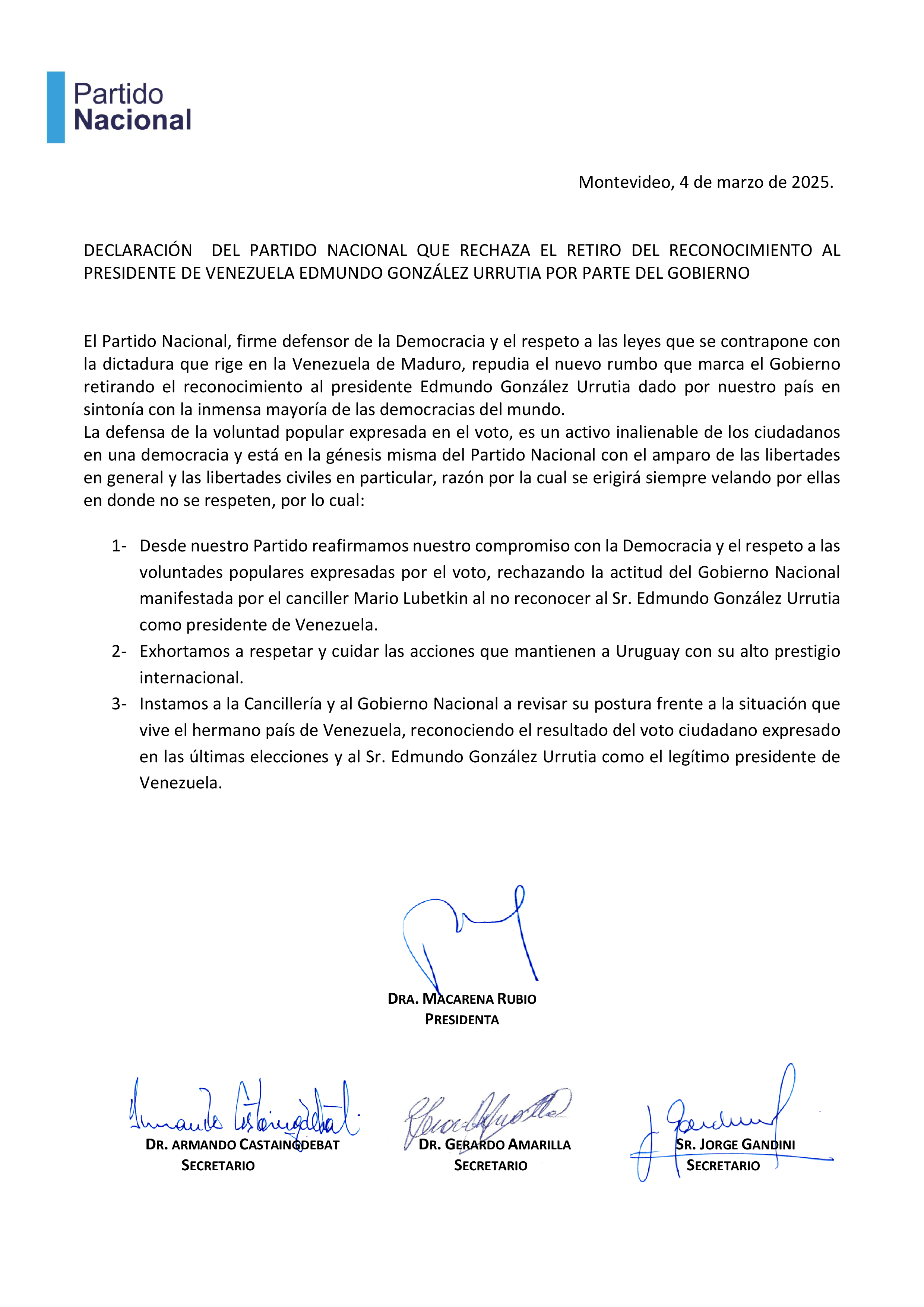 DECLARACIÓN DEL PARTIDO NACIONAL QUE RECHAZA EL RETIRO DEL RECONOCIMIENTO AL PRESIDENTE DE VENEZUELA EDMUNDO GONZÁLEZ URRUTIA POR PARTE DEL GOBIERNO Compartir